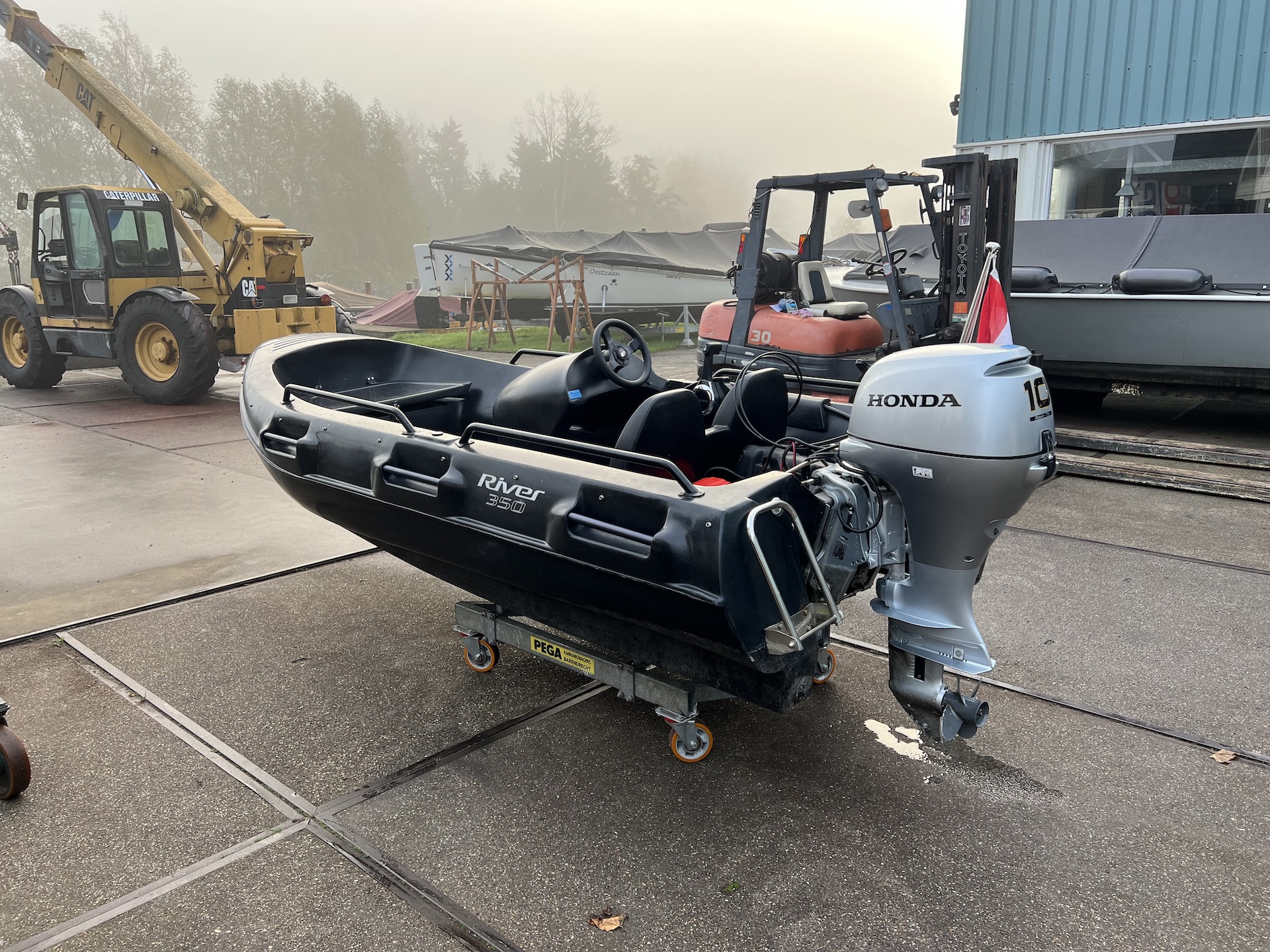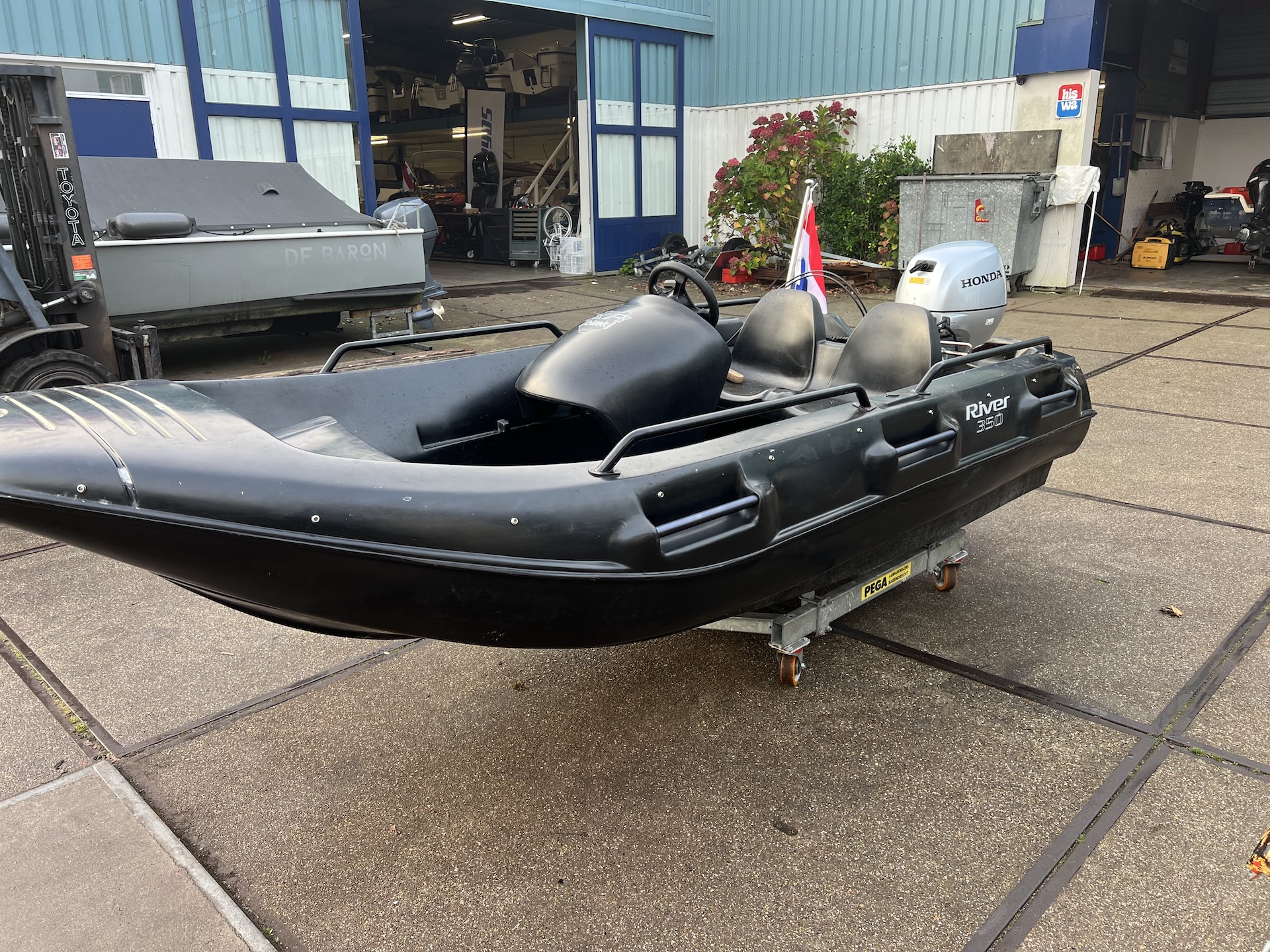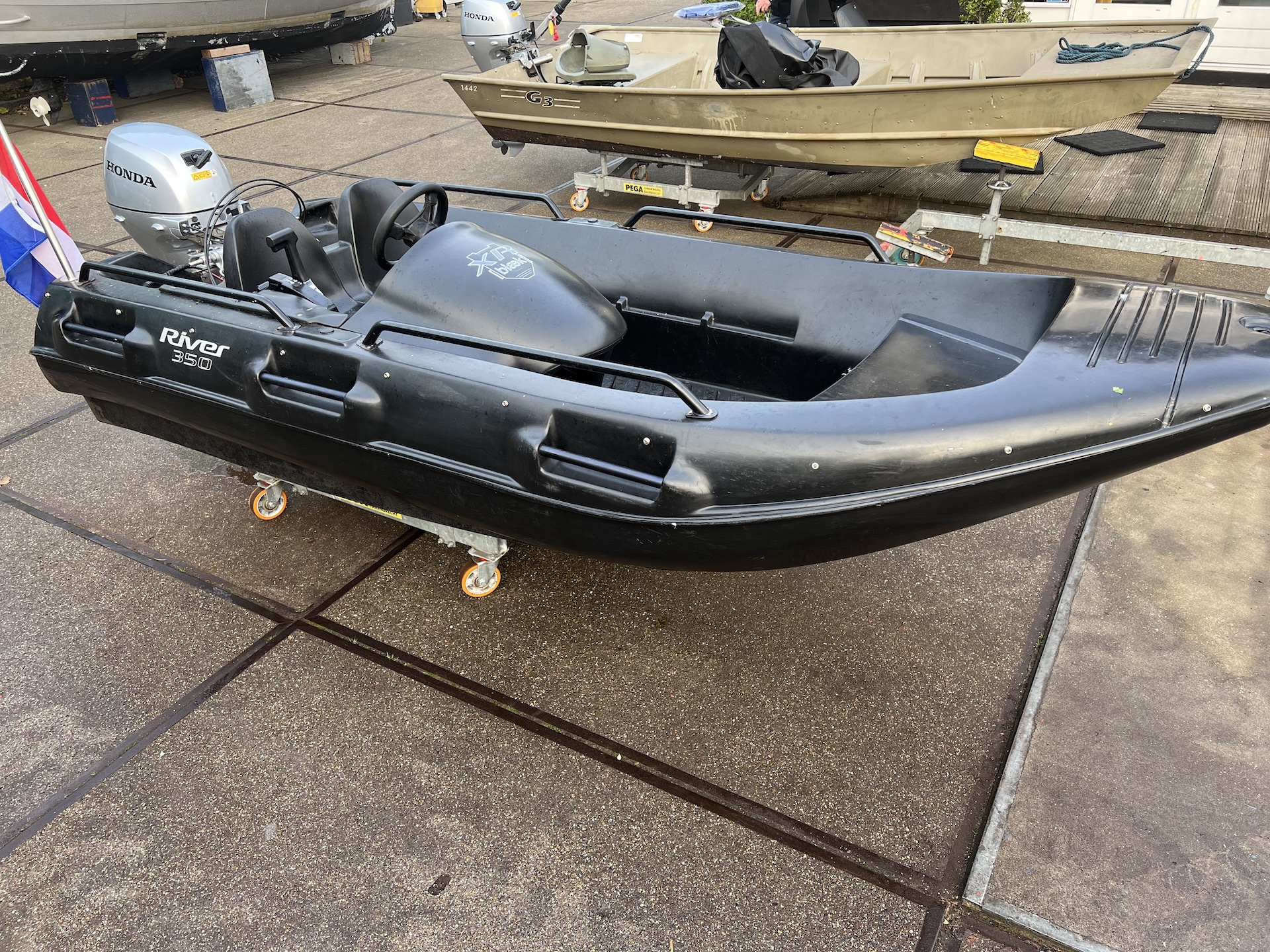 Te koop aangeboden: een stoere River 350 XR Blaek edition. De boot is geheel aangekleed met zwart gepoedercoat railing en onderscheidt dit van het standaardmodel. Daarnaast heeft dit model een rvs vlaggenstokhouder én zwemtrap. Compleet met afdekzeil, startaccu en 12L brandstoftank.